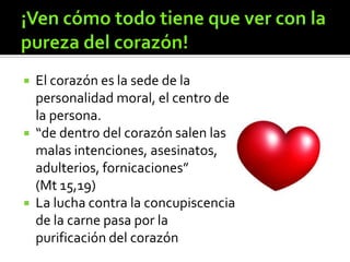 El documento habla sobre la importancia de cuidar tres áreas principales: la caridad, la castidad y el amor a la verdad en la fe. También discute varias formas de lograr la pureza, incluyendo mediante la virtud de la castidad, la pureza de intención, la pureza de la mirada interior y exterior, la oración y el recurso a los sacramentos.