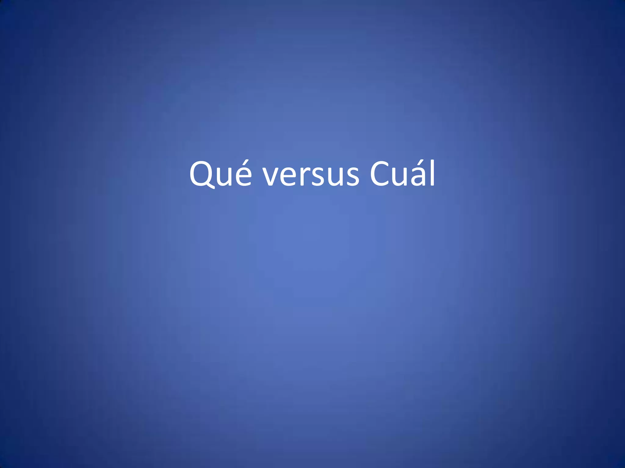 El documento explica la diferencia entre las palabras "qué" y "cuál" en español. Indica que "qué" se usa para pedir una definición, hechos o explicación y puede ir directamente seguido de un sustantivo, mientras que "cuál" se usa en otros casos para significar "qué" u "cuál" y típicamente no va seguido de un sustantivo sino de un verbo. Proporciona ejemplos para ilustrar el uso correcto de cada palabra.
