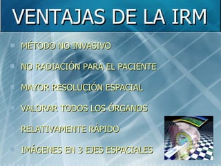 La resonancia magnética (IRM) es un método no invasivo y sin radiación que permite evaluar diversos órganos con alta resolución espacial de forma relativamente rápida. Entre sus ventajas se encuentran que no utiliza radiación, permite evaluar múltiples órganos y genera imágenes en tres ejes espaciales, mientras que sus desventajas incluyen el alto costo, incompatibilidad con marcapasos y la claustrofobia. La IRM puede utilizar diferentes secuencias como T1, T2, F