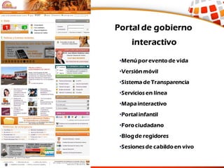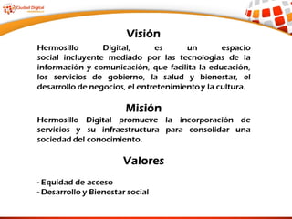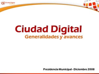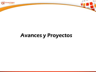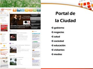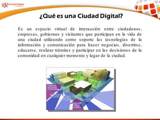 El documento habla sobre una ciudad inteligente que utiliza tecnologías de la información y comunicación para permitir que ciudadanos, empresas y gobiernos interactúen y participen en la vida de la ciudad de forma virtual. La ciudad inteligente busca ofrecer servicios de calidad a través de medios electrónicos, promover el uso de las TIC, apoyar el desarrollo económico local y crear un portal de e-gobierno y otro de la ciudad con servicios y productos.