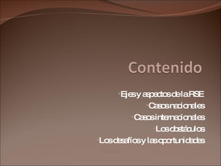 El documento presenta los conceptos y ejes de la responsabilidad social empresarial, incluyendo sus aspectos como derechos humanos, medio ambiente y derechos de los trabajadores. También analiza casos de empresas nacionales e internacionales que han adoptado prácticas de RSE y los desafíos que enfrentan, como la presión de grupos de interés y las barreras no arancelarias para acceder a nuevos mercados. Finalmente, enfatiza que la RSE requiere del compromiso de todos los actores sociales para lograr un desarrollo genu