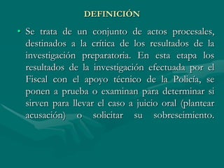La etapa intermedia es un conjunto de actos procesales que examinan los resultados de la investigación preparatoria para determinar si un caso puede avanzar a juicio oral o ser sobreseído, garantizando la presunción de inocencia y evitando juicios innecesarios. Esta etapa se caracteriza por su naturaleza jurisdiccional, funcional y oral, y permite a las partes presentar y debatir sus argumentos ante un juez. El sobreseimiento puede ser total o parcial, dependiendo de la evidencia disponible y la naturaleza del caso.