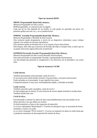 Este documento describe los diferentes tipos de memoria RAM, incluyendo DRAM, SRAM, VRAM, SIMM, DIMM y DIP. También describe RAM Disk, memoria caché y los diferentes tipos de memoria ROM como PROM, EPROM y EEPROM. Finalmente, detalla los diferentes tipos de procesadores de AMD como Sempron, Opteron, Turion y Celeron, e Intel como Intel 8086, Pentium MMX, Pentium Pro, Pentium IV, Pentium M, Pentium D, Pentium Core Duo y la serie Core i3, i5 e i7