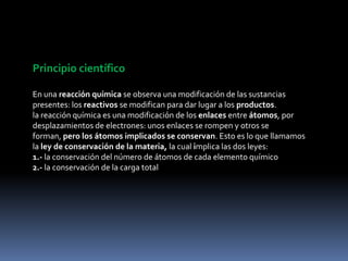 La estequiometria es el cálculo de las relaciones cuantitativas entre reactivos y productos en una reacción química. Para balancear una ecuación química, se asignan coeficientes a los reactivos y productos para asegurar la conservación de los átomos y la carga total. Al balancear una ecuación, los números de cada tipo de átomo deben ser iguales en ambos lados.