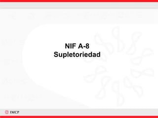 La NIF A-8 establece las reglas y requisitos para aplicar normas supletorias cuando no existe una NIF específica para un tema. Las normas supletorias deben cumplir ciertos criterios como estar vigentes, haber sido aprobadas por un organismo reconocido internacionalmente y no contradecir el Marco Conceptual de las NIF. La NIF A-8 también especifica los requisitos de revelación cuando se utiliza una norma supletoria.
