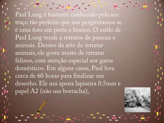 El documento habla sobre el arte de Paul Lung. Proporciona información sobre Lung, incluyendo fotos de su trabajo, así como detalles de formato, fuentes y créditos.
