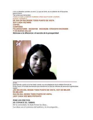 El documento ofrece consejos para superar obstáculos y fracasos, señalando que detrás de cada problema existe un beneficio mayor. También enfatiza que con frecuencia basta un paso más para alcanzar la prosperidad y que cometer errores no es desastroso sino una oportunidad para aprender lecciones de cara al futuro. Finalmente, anima a atreverse a ser diferente para alcanzar la prosperidad.