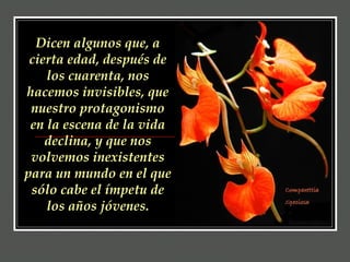 La autora reflexiona sobre cómo a cierta edad, después de los 40 años, las personas se vuelven "invisibles" para el mundo que valora la juventud. Sin embargo, ella nunca se había sentido tan consciente de su propia existencia y protagonista de su vida como ahora. Reconoce que ya no necesita que un príncipe la rescate y que ha encontrado paz al aceptarse a sí misma, con sus defectos y debilidades. Ahora disfruta plenamente de cada momento, acepta que no puede controlarlo todo y se da cuenta de que no es invisible sino protagon