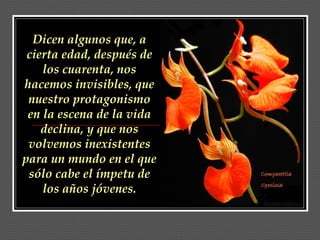 A cierta edad, después de los cuarenta, la autora se siente más consciente de su existencia y protagonista de su vida que nunca antes. Reconoce que ya no necesita que un príncipe la rescate y que puede amar y equivocarse sin tener que ser perfecta. Ahora acepta sus defectos y debilidades y se siente querida a pesar de ello. Disfruta el momento presente sin ansiedad por el futuro y entiende que solo ella es responsable de su felicidad.