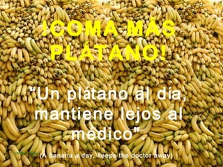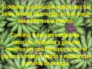 El documento describe los muchos beneficios nutricionales y para la salud del plátano. Contiene azúcares, fibra, potasio y vitaminas que proporcionan energía, ayudan a regular la presión arterial, mejoran el estado de ánimo, alivian la digestión y más. Se recomienda incluir plátanos en la dieta diaria para prevenir enfermedades y mantenerse saludable.