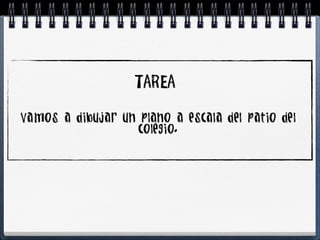 El documento describe un plan para medir el patio de la escuela sin un metro. Los estudiantes se dividirán en grupos para medir partes de la cancha de baloncesto con sus pies y anotar los resultados. Luego compartirán los datos en clase, los registrarán, realizarán cálculos para convertir las medidas de centímetros a metros, y acordarán una escala para dibujar un plano del patio.