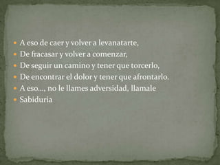 Este documento describe cómo diferentes situaciones de la vida como caer y levantarse de nuevo, fracasar y volver a empezar, y pasar por momentos buenos y malos, no deben ser llamadas adversidades, castigos o rutinas, sino sabiduría, enseñanza, experiencia y amistad.