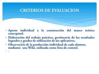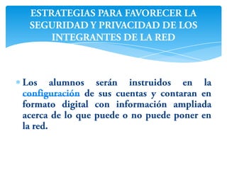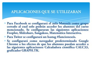 El documento describe estrategias de implementación en el aula para la búsqueda y gestión de información en la web, la compartición de documentos a través de Facebook y la síntesis de información usando herramientas como Cmap Tools y MindMap. También cubre estrategias de producción, comunicación y publicación que incluyen ver videos de YouTube, realizar guías de trabajo práctico de forma individual y compartirlas en el aula, y utilizar las redes sociales Facebook y Twitter para comprender conceptos matemáticos.