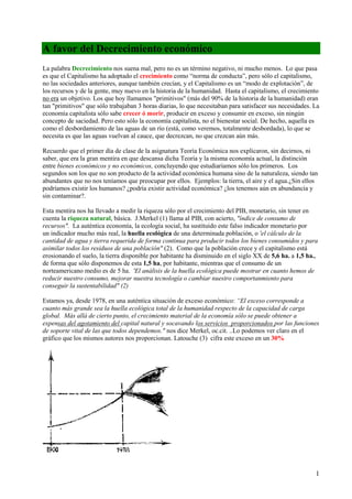 El documento argumenta a favor del decrecimiento económico en los países ricos y pobres. Sostiene que hemos sobrepasado los límites planetarios para el crecimiento debido a nuestra huella ecológica, y que es necesario reducir el consumo excesivo y la dependencia de recursos no renovables. También sugiere que el decrecimiento podría mejorar la calidad de vida al permitir más tiempo libre y trabajo menos alienante, mientras se preservan los recursos naturales para las generaciones futuras.