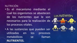 El documento trata sobre la nutrición y la respiración en los seres vivos. Explica que la nutrición es el mecanismo por el cual los organismos obtienen nutrientes para realizar procesos vitales, y que existen dos tipos de nutrición: autótrofa en plantas y heterótrofa en animales. También describe los procesos de respiración aerobia y anaerobia, e identifica los órganos respiratorios como branquias, pulmones y tráqueas en diferentes grupos animales. Finalmente, explica los conceptos de
