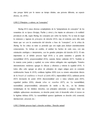 Este documento discute la naturaleza del derecho y el método jurídico. Sostiene que el derecho consiste en problemas singulares y concretos, no en reglas generales. Los principios como el debido proceso legal y la razonabilidad son más importantes que los conceptos. El documento también contrasta las aproximaciones del common law y el derecho continental europeo al derecho, señalando que el common law se enfoca más en los casos individuales mientras que el derecho continental se enfoca más en los sistemas y reglas generales.