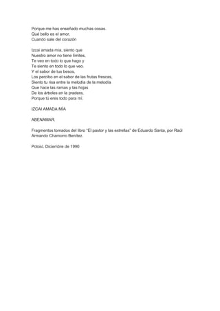 El documento es una carta de amor de Abenamar dirigida a su amada Izcai. Expresa que aunque la distancia los separe físicamente, su amor los mantendrá unidos. Compara la distancia al tiempo, que solo puede medirse a través de las cosas materiales y no las emociones del alma. Afirma que su amor por Izcai es tan grande que han logrado enamorarse de su propio amor.