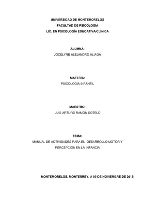 Este documento presenta un manual de actividades estimuladoras para el desarrollo motor y perceptivo en la infancia. Explica que el juego es importante para que los niños aprendan y desarrollen habilidades mientras se divierten. Luego describe 13 actividades motrices y perceptivas para estimular el desarrollo grueso y fino, y mejorar la coordinación, equilibrio y percepción visual y auditiva de los niños. El objetivo es favorecer el dominio del cuerpo y entorno durante la primera infancia.
