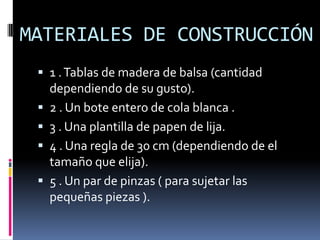 El documento proporciona instrucciones para construir un avión de madera. Explica los materiales necesarios como tablas de balsa, cola blanca y una plantilla de papel de lija. Luego detalla los pasos para construir el esqueleto, marcar y dar forma a las alas, pegar las alas y el timón en ángulos específicos, y unir todas las piezas para completar el avión de madera.