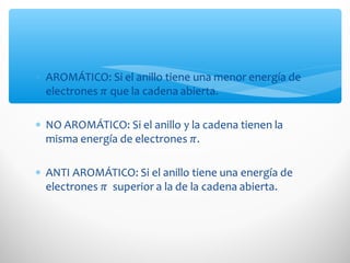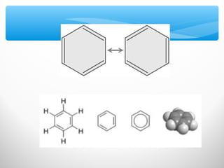 El documento describe las propiedades de los compuestos aromáticos como el benceno. Explica que el benceno es un hidrocarburo poliinsaturado con forma de anillo que cumple la regla de Hückel y es extremadamente estable. También describe las reacciones de sustitución electrofílica aromática que retienen la conjugación del anillo en lugar de reacciones de adición. Finalmente, resume que el benceno es un híbrido de resonancia cuya estructura es intermedia entre dos formas de enlace.