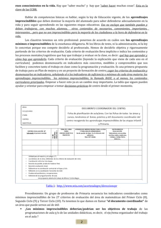 Este documento propone instrumentos y estrategias para integrar las competencias básicas en las aulas escolares con el objetivo de mejorar la calidad educativa. Sugiere analizar los criterios de evaluación para identificar los aprendizajes mínimos e imprescindibles, desarrollar tareas que requieran la aplicación práctica de conocimientos, y dedicar tiempo en clase a adquirir dichos aprendizajes básicos necesarios para la vida diaria.