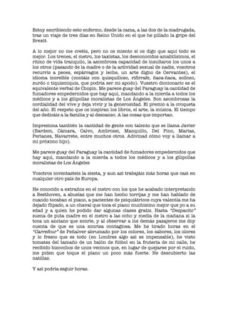 En esta carta abierta, el pianista y escritor James Rhodes expresa su gran entusiasmo por España, el país que ahora considera su hogar. Describe las muchas cosas que ama de España, como la gente amable, la vida más tranquila, la cultura y la comida. Aunque reconoce que España también tiene problemas, cree que los españoles han mantenido su bondad y hospitalidad a pesar de las dificultades. Finalmente, expresa su profunda gratitud hacia España por hacerlo sentir seguro y bienvenido.