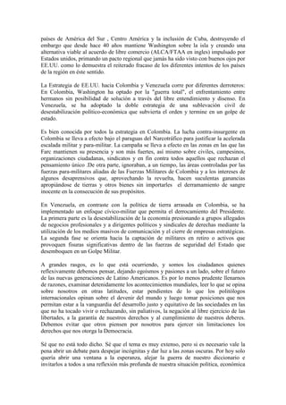 Este documento habla sobre la política de EE.UU. hacia Colombia y Venezuela y los esfuerzos para mantener el control e influencia en la región. Argumenta que EE.UU. apoya regímenes clientes y socava gobiernos independientes, enfocándose en desestabilizar a Colombia y Venezuela debido a su importancia geoestratégica y recursos petroleros. En Colombia, EE.UU. ha optado por una "guerra total" mientras que en Venezuela usa una estrategia de desestabilización civil y golpe de estado. El documento hace un llamado al diálogo y entend