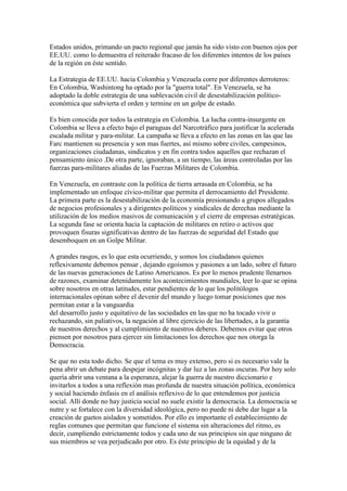 Este documento hace un análisis de la situación política en Colombia y Venezuela y la estrategia de Estados Unidos en la región. Argumenta que EE.UU. busca mantener el control sobre los gobiernos aliados en América Latina y socavar a los gobiernos independientes. En particular, tiene gran interés en Colombia y Venezuela debido a su producción de petróleo y ubicación geoestratégica. En Colombia ha adoptado una "guerra total" contra las guerrillas, mientras que en Venezuela usa una estrategia de desestabilización económica y política para