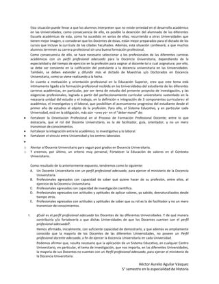 Este documento discute el perfil profesional adecuado para docentes universitarios. Argumenta que la mayoría de docentes universitarios carecen de un perfil apropiado para la docencia. Propone que se debe seleccionar a los profesionales para cargos docentes basado en su especialidad y experiencia, y ofrecer más capacitación en docencia universitaria. También sugiere fortalecer la orientación profesional, la integración entre lo académico y lo laboral, y enfatizar el rol del docente como facilitador más que transmisor