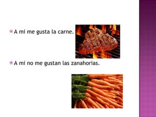La persona a la que le gusta la carne y la pasta pero no le gustan las zanahorias ni el pollo. A su madre le gusta la sopa pero no los frijoles. A ella y su amiga les gusta la pizza pero no les gusta el cerdo.