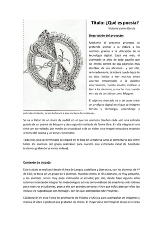 Este documento describe un proyecto para acercar a los estudiantes a la lectura de poesía de Bécquer mediante el uso de la tecnología. Los estudiantes crearán entradas en Padlet con un poema, su recitado en audio o video, imágenes e interpretaciones. Publicarán esto en un blog y grabarán videos para un canal booktube. El proyecto desarrollará competencias lingüísticas, digitales, de aprendizaje autónomo y culturales a través de 7 sesiones de lectura, análisis y producción de contenidos