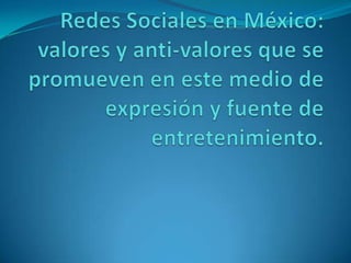 El documento describe el uso generalizado de las redes sociales en México. Señala que aproximadamente el 60% de los internautas mexicanos usan redes sociales diariamente, siendo Facebook, YouTube y Twitter las más populares. Los usuarios principales se encuentran entre 12 y 25 años y viven en las ciudades más pobladas como la Ciudad de México, Estado de México y Jalisco. Las redes sociales se usan principalmente para comunicarse con amigos y familiares y seguir noticias, aunque los expertos advierten sobre la falta de veracidad de toda la inform