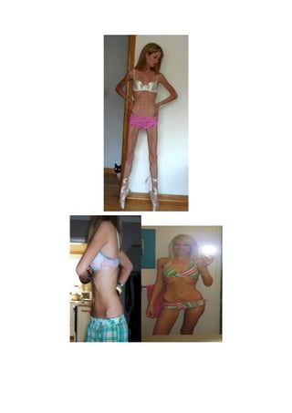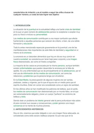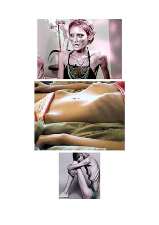 La anorexia es un trastorno alimenticio caracterizado por un bajo peso corporal y una imagen distorsionada del cuerpo. Tiene causas psicológicas como la baja autoestima y perfeccionismo, así como factores sociales como la presión por la delgadez en los medios. Los síntomas incluyen el rechazo a la comida y el miedo a engordar a pesar de un peso bajo, lo que puede llevar a consecuencias como la amenorrea y decaimiento físico. La anorexia ha existido desde la Edad Media