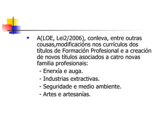 La nueva formación profesional en España conlleva modificaciones en los currículos de los títulos de formación profesional y la creación de nuevos títulos asociados a cuatro nuevas familias profesionales. El documento también describe el sistema nacional de cualificaciones profesionales de España, que incluye el catálogo nacional de cualificaciones y las unidades de competencia.