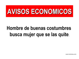 Este documento contiene una serie de avisos económicos humorísticos con juegos de palabras, incluyendo ofertas como funerarias que ofrecen estuches para suegras, hombres que buscan quitar costumbres a mujeres, y pilotos de prueba para fabricas de supositorios.