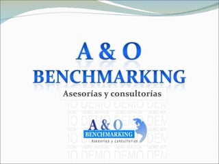 A&O Benchmarking es una empresa que utiliza teorías modernas para ofrecer soluciones eficaces a las dificultades empresariales, buscando convertirse en líder en asesorías en 2015. Se dirige a empresas con problemas económicos o financieros en Santander, ofreciendo mejoras en ventas, administración y competitividad. Su enfoque se basa en el benchmarking y la estrategia del océano azul, destacándose por su asesoría personalizada y cumplimiento normativo.