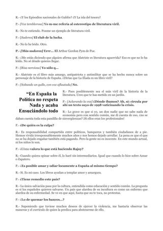 Pérez-Reverte critica que Internet promueve la estupidez al no discriminar entre contenidos valiosos y triviales. Además, opina que la crisis económica española se debió a la irresponsabilidad de políticos, banqueros y ciudadanos, aunque reconoce que los jóvenes de hoy son más lúcidos. Finalmente, cree que la única salvación de España pasa por fomentar la cultura y el sentido común entre la población.