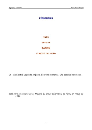 Este documento presenta un resumen de la obra de teatro "A puerta cerrada" de Jean-Paul Sartre. La obra se desarrolla en una sola habitación con tres personajes: Garcin, Inés y Estelle. Garcin es el primero en llegar y conversa con el mozo, quien le explica la situación sin ventanas, espejos o forma de escapar. Luego llega Inés, quien cree erróneamente que Garcin es su verdugo. Tras presentarse, intentan adaptarse a la situación en la que se encuentran encerrados.