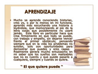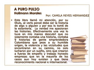 Este libro cuenta 9 historias de emprendedores colombianos que a pesar de sus humildes orígenes y las dificultades que enfrentaron, lograron crear exitosas empresas a través de su esfuerzo y trabajo honesto. El documento destaca que no se necesitan títulos universitarios sino constancia y visión para generar una empresa. Además, enseña lecciones como la tenacidad, el liderazgo, no aceptar un no por respuesta y aprovechar las oportunidades. El autor recomienda el libro porque las histor