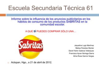 El documento resume los resultados de una encuesta aplicada a 50 estudiantes de una escuela secundaria sobre los hábitos de consumo de productos Sabritas y la influencia de la publicidad. La mayoría de los estudiantes consumen los productos Sabritas con cierta frecuencia y recuerdan anuncios publicitarios de la marca, aunque sus hábitos de compra no parecen estar directamente relacionados con la publicidad.