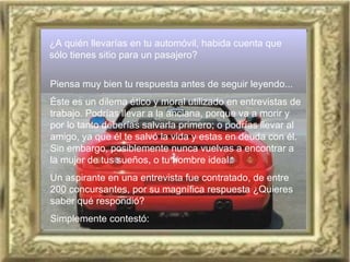 El documento presenta un dilema ético sobre a quién llevar en un automóvil con solo un asiento disponible entre una anciana enferma, un viejo amigo que salvó la vida de la persona antes, o la mujer/hombre de sus sueños. El candidato ideal en una entrevista propuso darle las llaves del auto al amigo para que llevara a la anciana al hospital mientras él esperaba el autobús con la mujer de sus sueños. El documento concluye enfatizando la importancia de plantear los problemas correctamente y prestar atención a nuestras