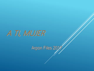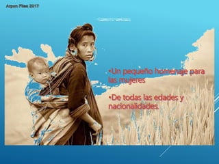 Este documento rinde homenaje a las mujeres de todas las edades y nacionalidades, especialmente aquellas que luchan por sobrevivir a pesar de las dificultades y mantienen la capacidad de sonreír. Incluye poemas que celebran la feminidad, la maternidad y la fortaleza de las mujeres.