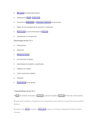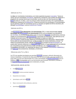 El documento define los tics como movimientos musculares involuntarios y sin motivo aparente que son comunes en niños entre 8 y 12 años. Define las TIC como tecnologías que permiten procesar, almacenar y transmitir información de forma instantánea e incluyen dispositivos como teléfonos móviles e Internet. Explica que las diferencias entre Tics y TICs es que los primeros son movimientos musculares mientras que las segundas son tecnologías que han evolucionado para incluir más dispositivos. Finalmente, resume un estudio