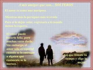 El documento ofrece consejos sobre el amor dirigidos a diferentes tipos de amigos, incluyendo solteros, casados, comprometidos, con el corazón roto, inocentes, posesivos, con miedo a confesar sus sentimientos y aquellos que aún están aguantando una relación que no vale la pena. Alienta a tomarse el tiempo para elegir a alguien que realmente se merezca el amor, a aprender de las experiencias dolorosas, y a dejar ir a quien no valga la pena para encontrar a alguien cuyo am