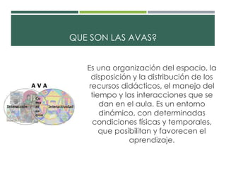 Este documento describe los ambientes virtuales de aprendizaje (AVAs). Explica que los AVAs son entornos dinámicos que usan tecnología para facilitar la interacción y el aprendizaje, rompiendo las barreras espacio-temporales de un aula tradicional. Los AVAs permiten un mayor acceso a la información, comunicación, y estrategias de aprendizaje para estudiantes. El documento concluye que tanto los ambientes de aprendizaje tradicionales como los virtuales deben proporcionar recursos, contenido y oportun