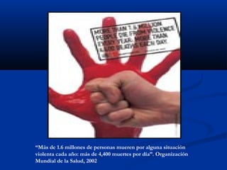 El documento describe la violencia en la adolescencia y los factores asociados a ella. Menciona que más de 540 adolescentes y jóvenes mueren diariamente a causa de la violencia interpersonal, y que la tasa de delincuencia es mayor en hombres adolescentes y jóvenes que en mujeres. Entre los factores de riesgo se encuentran la pobreza, la desintegración familiar, el abuso de sustancias, y la exposición a la violencia. Se requieren esfuerzos de prevención que aborden estos factores a nivel individual, familiar y comunit