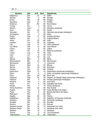 Este documento presenta una tabla con las 88 constelaciones reconocidas por la Unión Astronómica Internacional. La tabla incluye el nombre en latín, la abreviatura de 3 letras, la ascensión recta y declinación del centro de cada constelación, y un breve significado o descripción. Algunas de las constelaciones más conocidas son Orión, el Cisne, Casiopea, y las Osas Mayor y Menor.