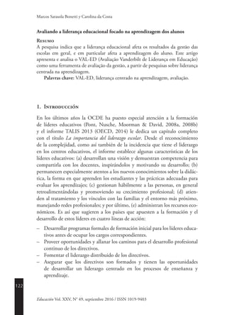 Este documento presenta y analiza el VAL-ED (Vanderbilt Assessment of Leadership in Education) como un instrumento para evaluar el liderazgo educativo centrado en los aprendizajes del alumnado. El VAL-ED se basa en investigaciones que muestran que el liderazgo escolar afecta los resultados académicos de los estudiantes a través de canales racionales, emocionales, organizacionales y familiares. Además, el documento discute el liderazgo distribuido y el liderazgo centrado en la justicia social como enfo
