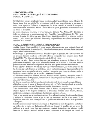 El documento critica la corrupción de varios exgobernadores priistas como Andrés Granier Melo de Tabasco, Tomás Yarrington de Tamaulipas y Humberto Moreira de Coahuila, quienes saquearon las arcas estatales y se enriquecieron ilícitamente. Se cuestiona si una exlíder del PRI como Elba Esther Gordillo habría corrido una suerte diferente si aún estuviera ligada al partido, y si el presidente Peña Nieto realmente sólo busca proteger el interés del país como dice o más bien