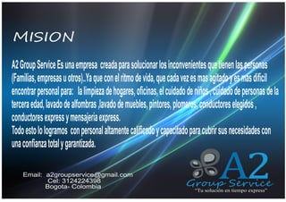 A2 Group Service es una empresa que ofrece una variedad de servicios express, incluyendo el cuidado de niños y personas de la tercera edad, aseo para el hogar y oficinas, mantenimiento general, lavado de alfombras y muebles, conductores elegidos, y mensajería. La empresa busca ser la mejor opción para solucionar las necesidades de sus clientes de manera rápida y confiable.